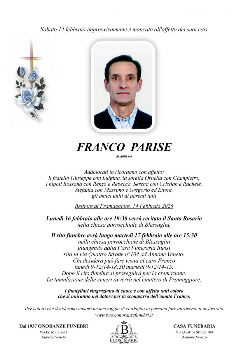 Lascia gratuitamente un messaggio di cordoglio, sarà nostra cura consegnarlo ai congiunti di Franco Parise.
