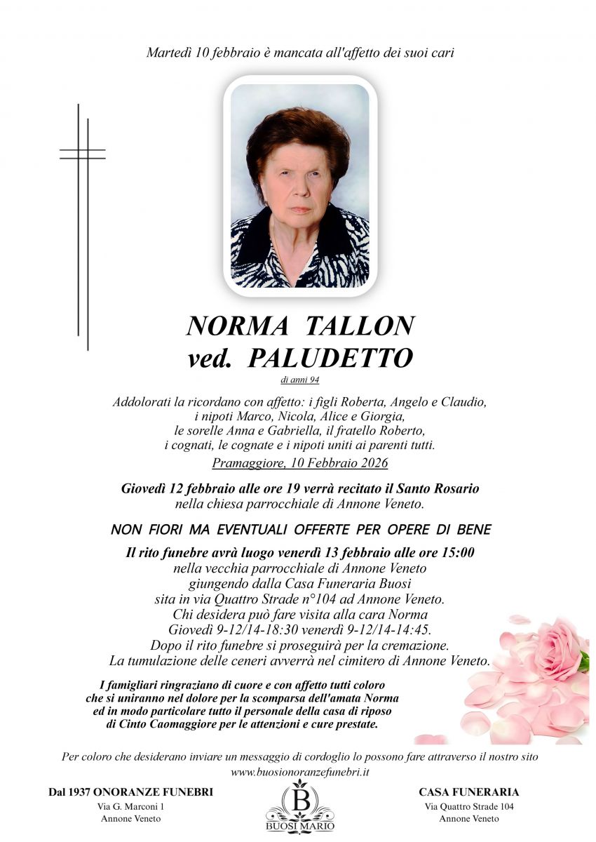 Lascia gratuitamente un messaggio di cordoglio, sarà nostra cura consegnarlo ai congiunti di Norma Tallon.